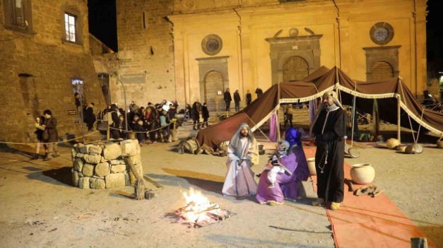 nella città che muore, viene raffigurato il presepe vivente. In queste notti magiche Civita si illumina di fiaccole e le case in tufo diventano delle botteghe del tempo di Gesù.